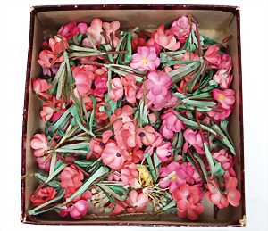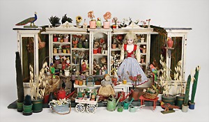 Kaufladen, eingerichtet als Blumenladen, 70 cm breit, 30 cm hoch, alte Tapete, alte Bemalung, ohne Schubladen, reichh. Zubehör, dekorativ
