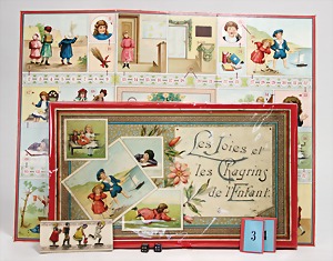 Puppenstuben-Kaufladen, eingerichtet als Spielwarengeschäft, 82 cm breit, 28 cm hoch, farbl. überarbeitet, ohne Schubladen, reichh. Zubehör, meist alt