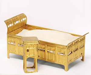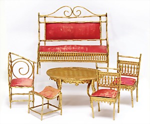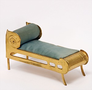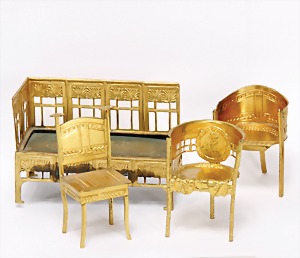 Gold/Blech, Sitzgruppe, mit 2 Tischen, Bank, 9 cm, 4 Armsessel, roter Samtbezug, ausgefallen