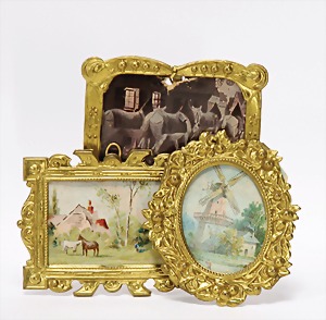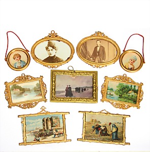 9 Teile Puppenstuben-Bilder, 1 x Rahmen Gold/Blech, sonst Rahmen Zinn, 4 – 7,5 cm