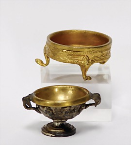 Gold/Blech, 2 außergew. Schalen, 1 x mit geflügelten Henkeln, 1 x Löwenfüße, Durchm. 2,5 cm u. 3 cm