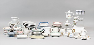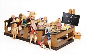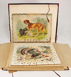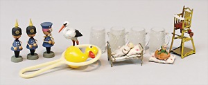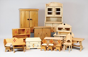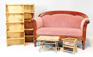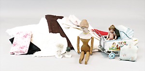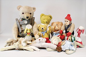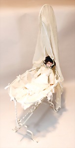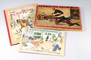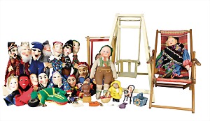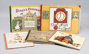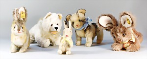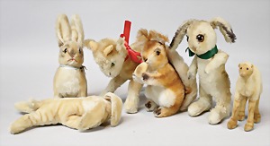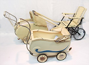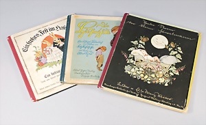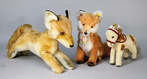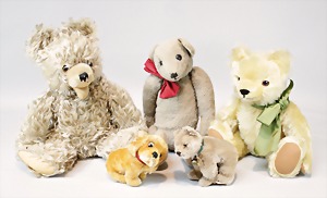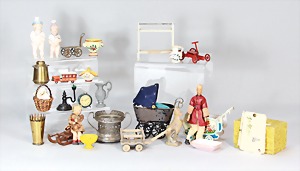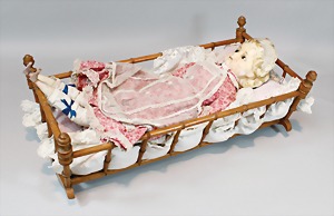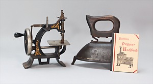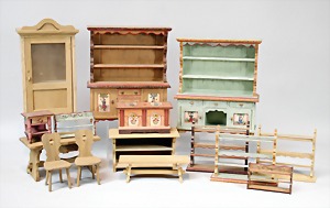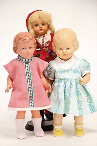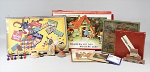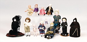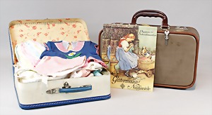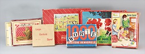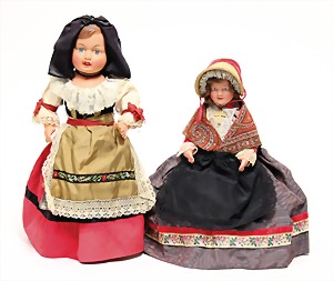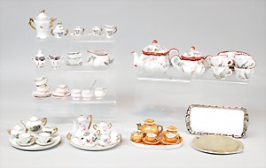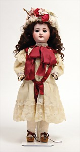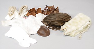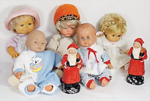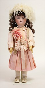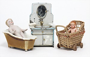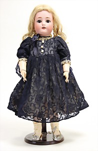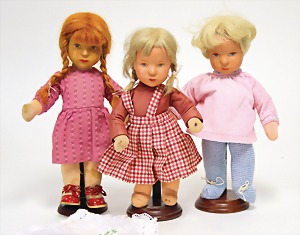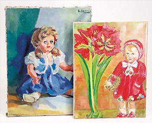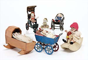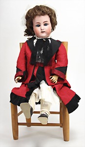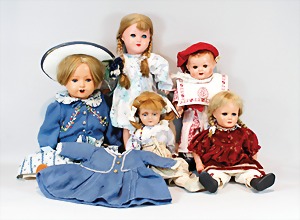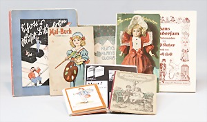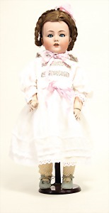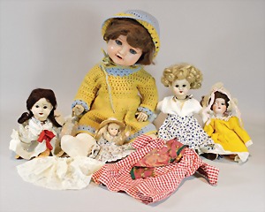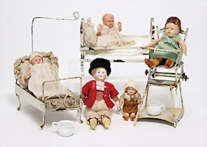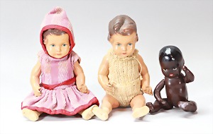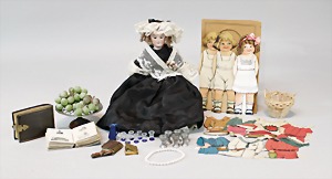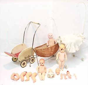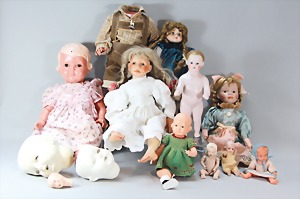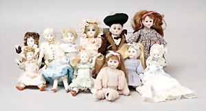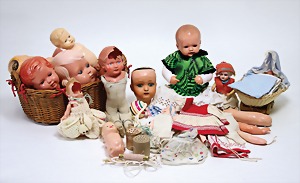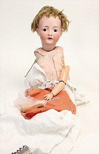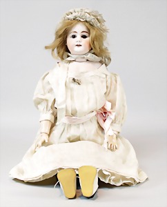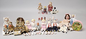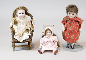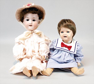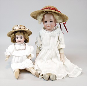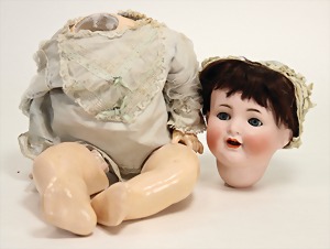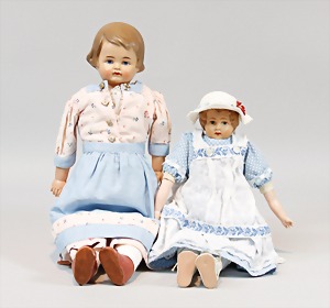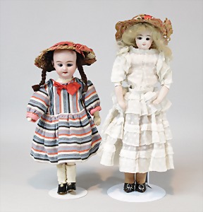 2 Porzellankopf-Puppen, 1 Porzellan-Brustblatt, kl. Risse am Brustblatt, braune fest eingesetzte Glasaugen, geschl. Mund, Korkdeckel, Mohairperücke, Stoffkörper, Porzellan-Unterarme, Körper neuer, 35 cm, 1x Porzellankopf-Puppe, gem. Halbig 1009 Germany, blaue Schlafaugen, off. Mund, Zähne, durchst. Ohren, Mohairperücke, Masse-Gliederkörper, feste Handgelenke, 2 Finger weggebrochen, linkes Bein überstrichen, 27 cm