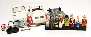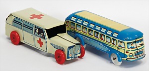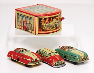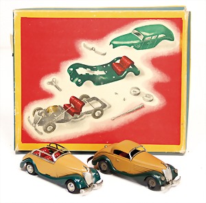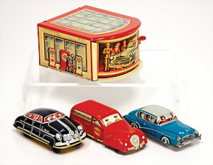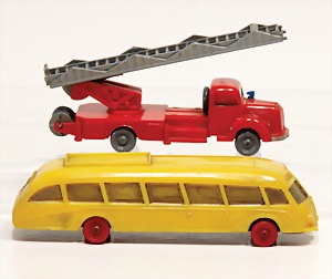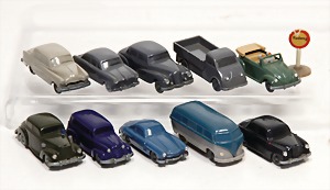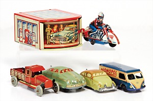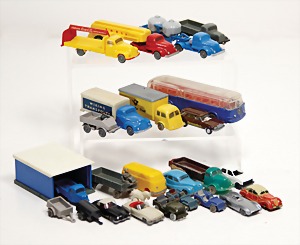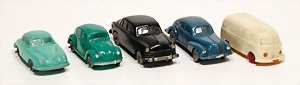 Konv. Wiking, 5 Teile, Quetschachsen, ohne Bodenplatte, VW Bus, geteilte Frontscheibe, kl. Haarriss im Dach, 1 Achse verbogen, Porsche 356, geteilte Frontscheibe, ohne Bodenplatte, Quetschachsen, hellgrün, kl. Kratzer am Dach, sonst gut, 2 Limousinen, bespielt, gut, 1 Käfer, dunkelgrün, Brezelfenster, sehr guter Zust., alle ohne Bodenplatte, Quetschachse