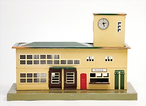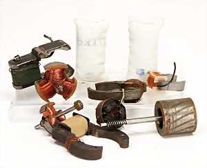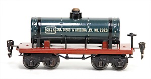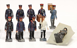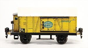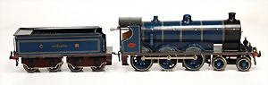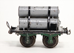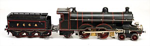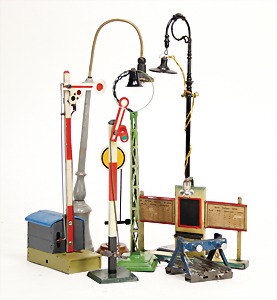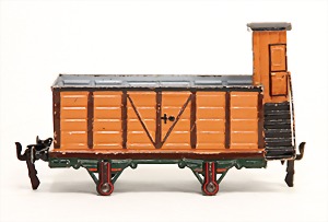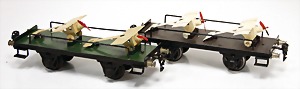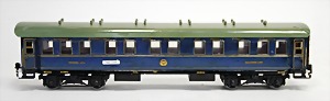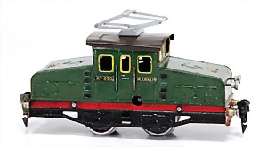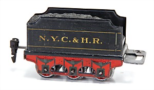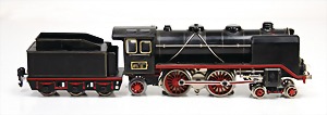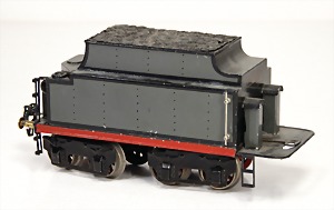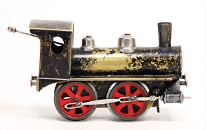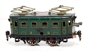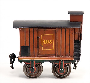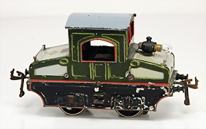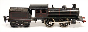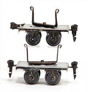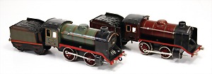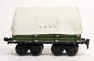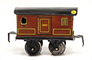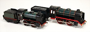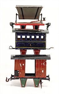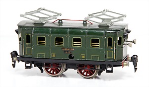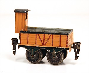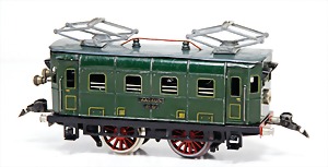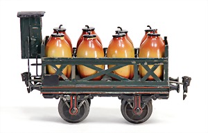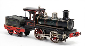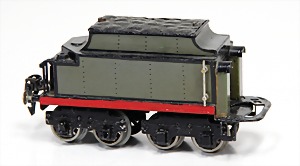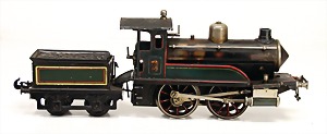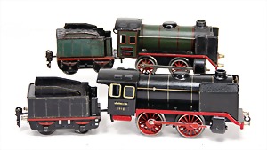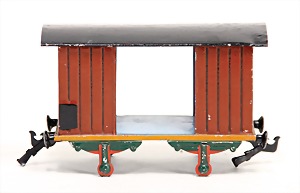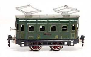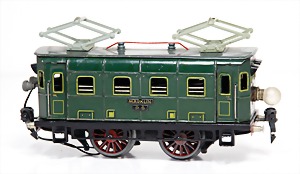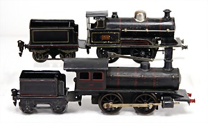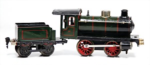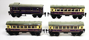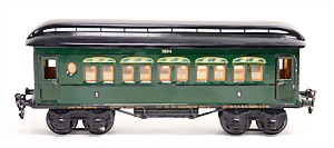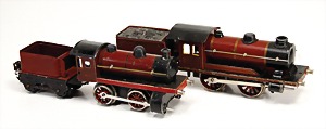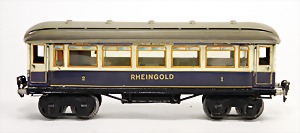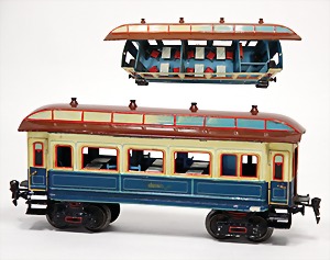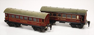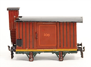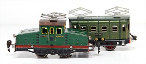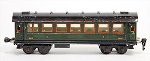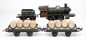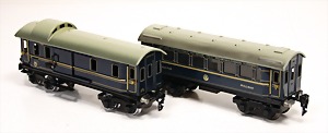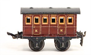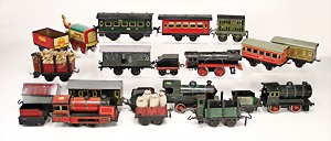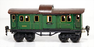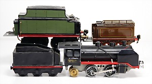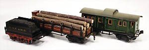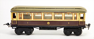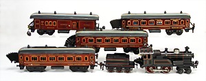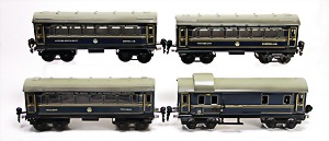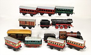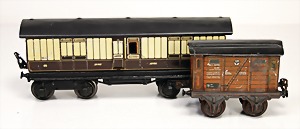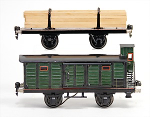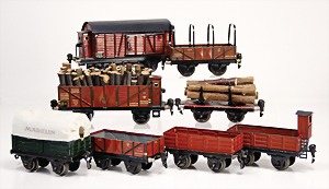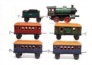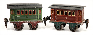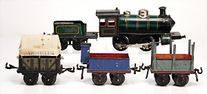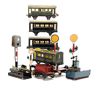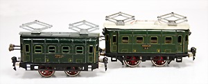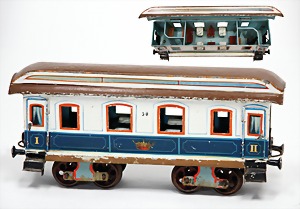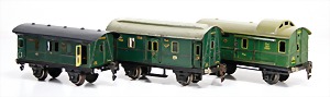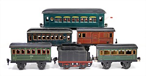 Konv., Märklin Spur 1, 4-achsige Personenwagen, restauriert, 1 x 2-achsiger Tender, bespielt, 1892, Personenwagen, bespielt, stärkere Lackfehler am Dach, 1972, 2-achsiger Personenwagen, bespielt, 1891, 2-achsiger Gepäckwagen, bespielt, 1894, stärker bespielt