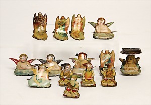 Christbaumschmuck, 14 Klammern, Blech lithogr., Engel, Zwerge u. andere Darstellungen, teilw. Brandfehler