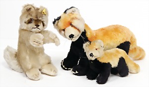 Reinhold, Nashorn, kompl., Nr. 4322.05, Schild mit Knickstelle, ein wenig verschmutzt, guter Zust., 1 Nosy, Nashorn, 30 cm, ohne Knopf, mit Schild, bespielt, 1 Mockie, Nielpferd, 19 cm, mit Schild, ohne Knopf, 1 Ohr fehlt, 1 Mockie, 30 cm, mit Knopf, Reste der Fahne, ohne Schild, 1 Auge locker, bespielt-gut