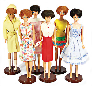 Konv. 5x Midge, brunette u. rothaarig, Straight-Leg, 1 Kopf mit kl. Spliss, in Orig.-Kleidung, nicht kompl.