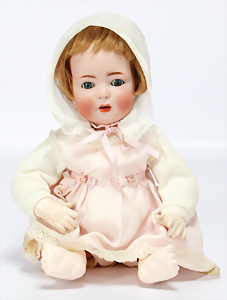 Konv. 3 Baby-Puppen, Porzellan, HEUBACH 342, 52 cm, Echthaar-Perücke, braune Schelmenaugen, off. Mund, Zähne u. Zunge, Masse-Stehkörper, GÖBEL 201, Charakter-Baby, 56 cm, alte Mohair-Perücke, blaue Schlafaugen, off. Mund, oben Zähne, Zunge, Sitzbaby-Körper, Charakter-Baby, gem. C&P 263 50, mit im Kopf eingebauter Stimme, Stimme intakt, 48 cm, blaue Schlafaugen off. Mund, Zähne u. Zunge, Sitzbaby-Körper, alte Mohair-Perücke