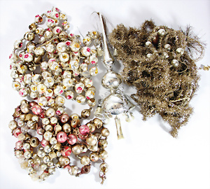 Konv. Weihnachtsschmuck, darunter 3 Engel mit Masse-/ Wachsköpfen u. Goldfolie, dazu einige Päckchen altes Silber-Lametta u. Eiszapfen, einige Papier- u. Papiermaché-Anhänger, Feenhaar, u.a.