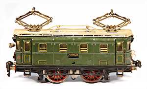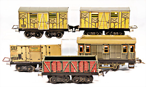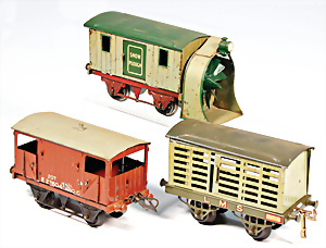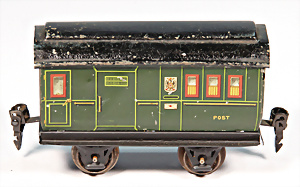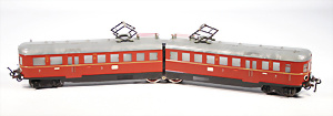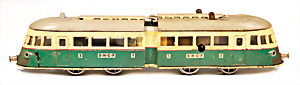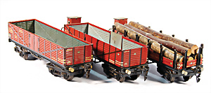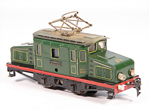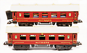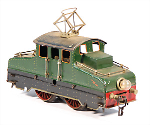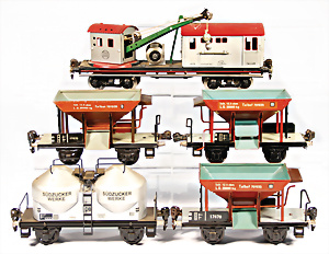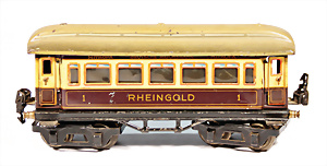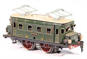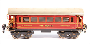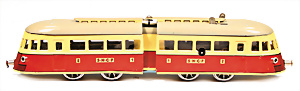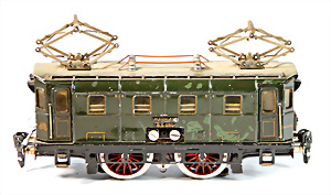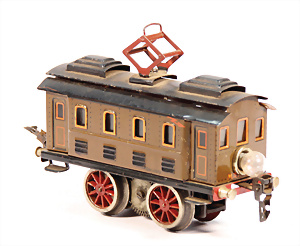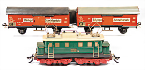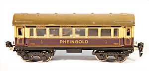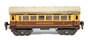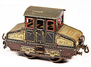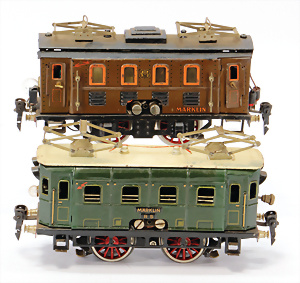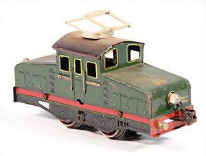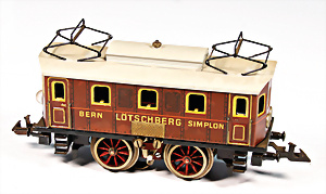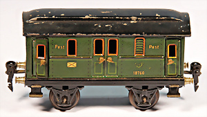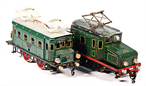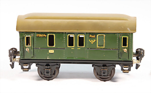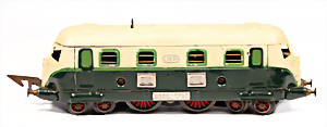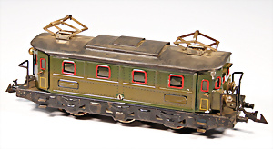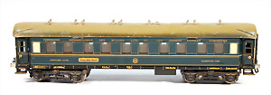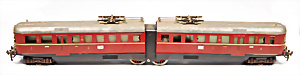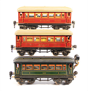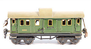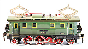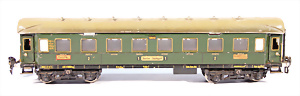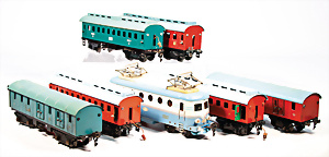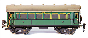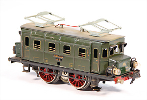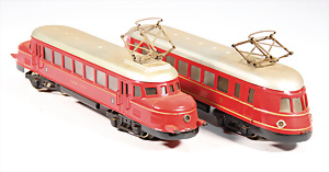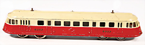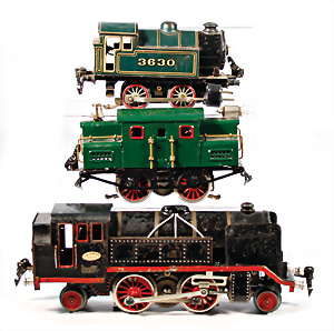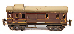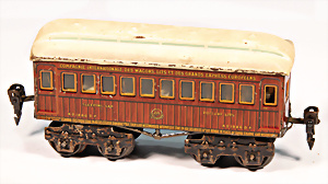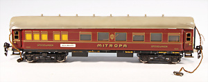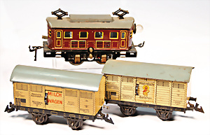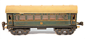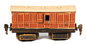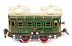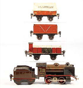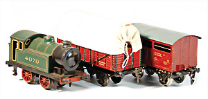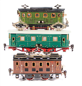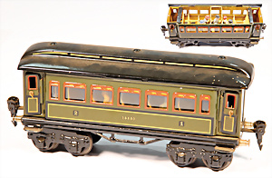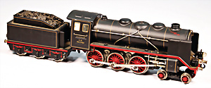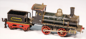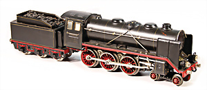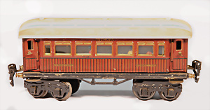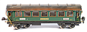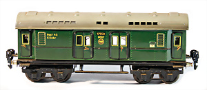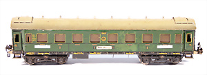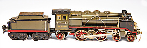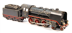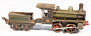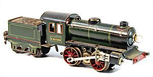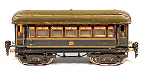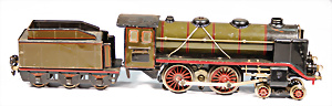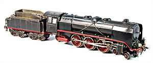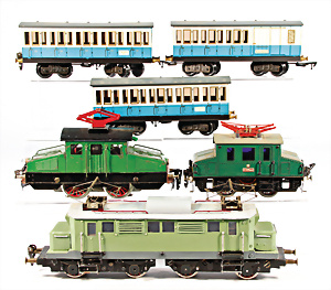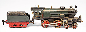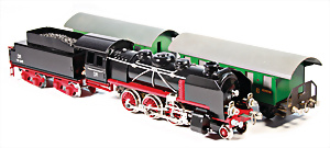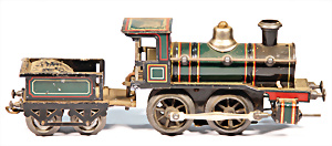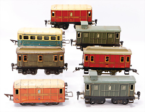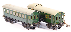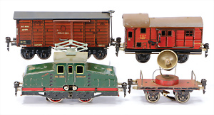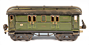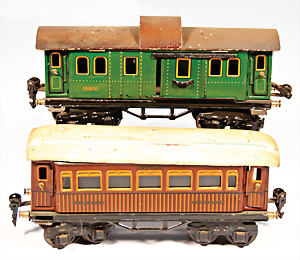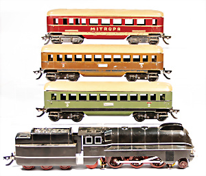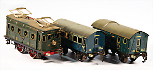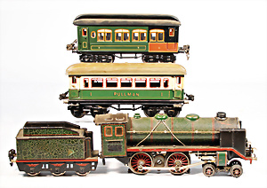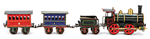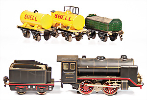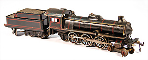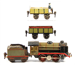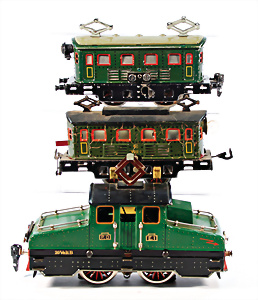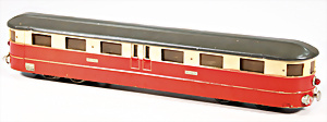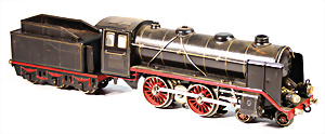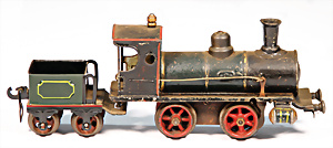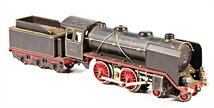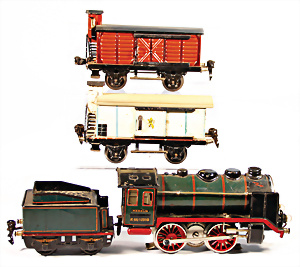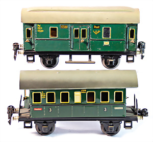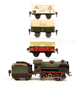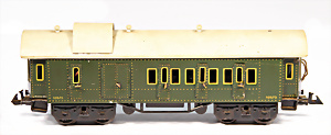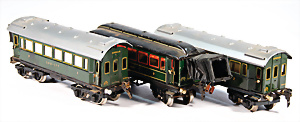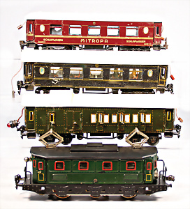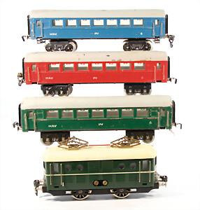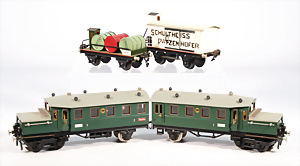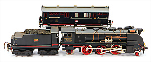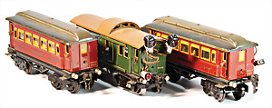 Spur 0, R12950N, Schlepptender-Lok, B, rot / schwarz mit gelben Zierlinien, Dach wohl farbl. überarbeitet, dazu 1721, Personenwagen, 2. Klasse, rot, 1721, Personenwagen, 2. Klasse, grün, leicht bespielt guter Zust., 1 Gepäckwagen, 1722, Lackfehler am Dach