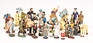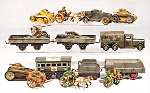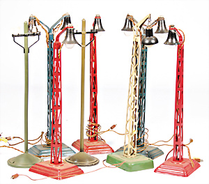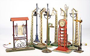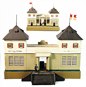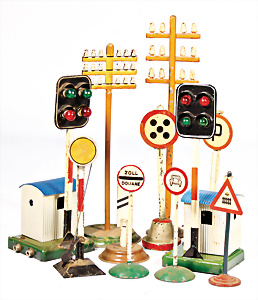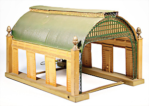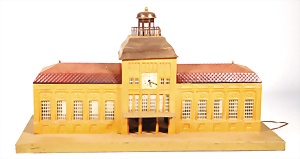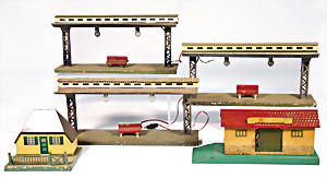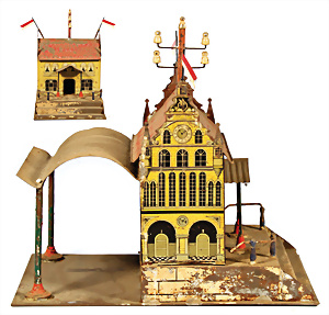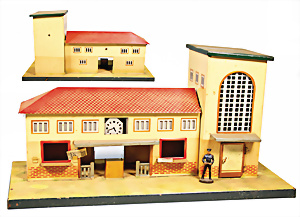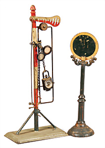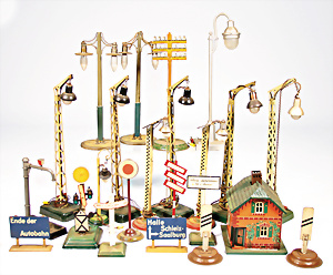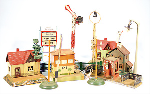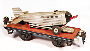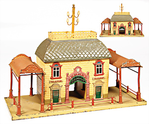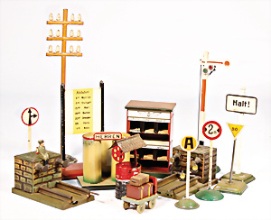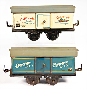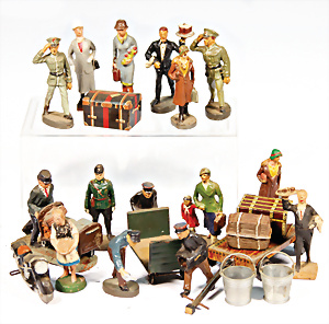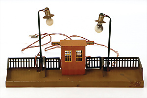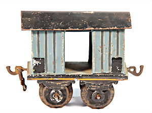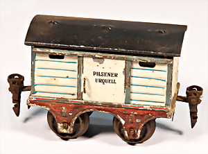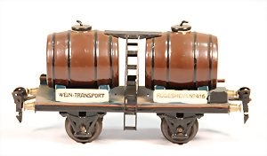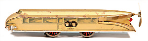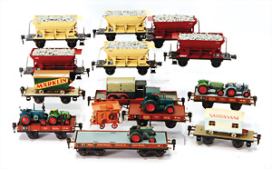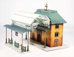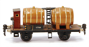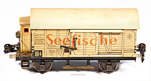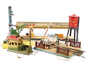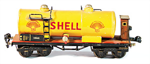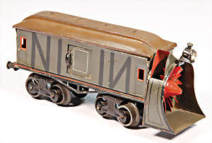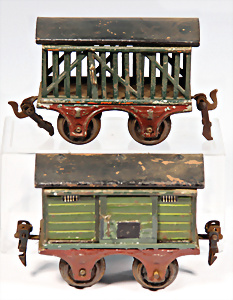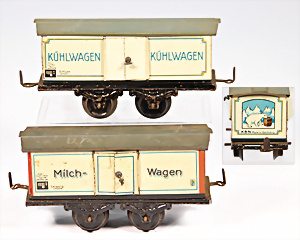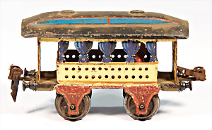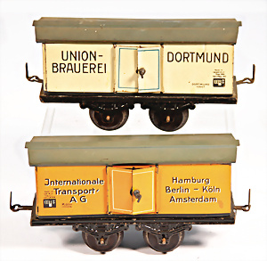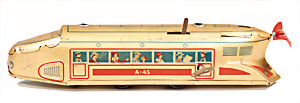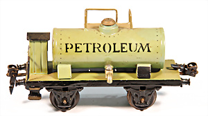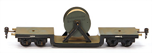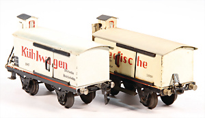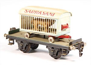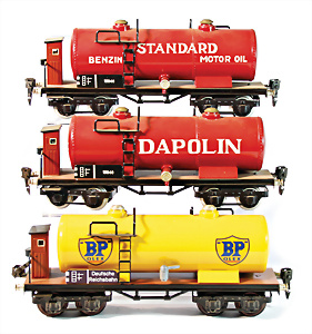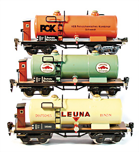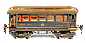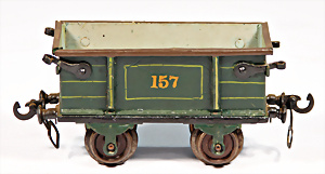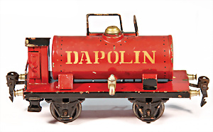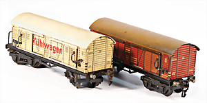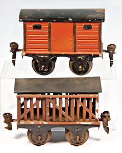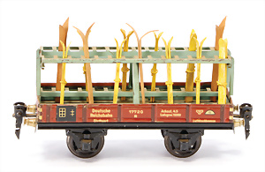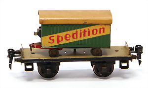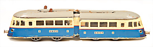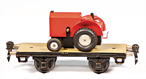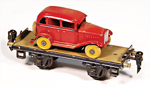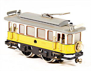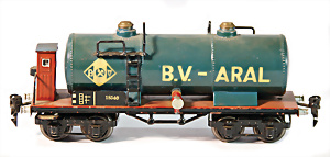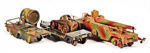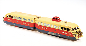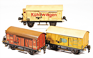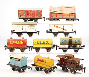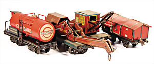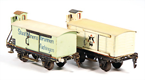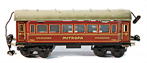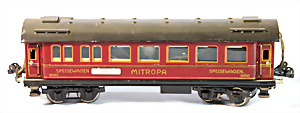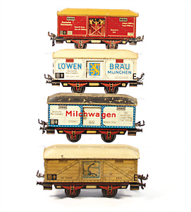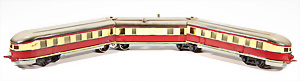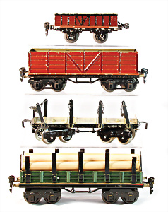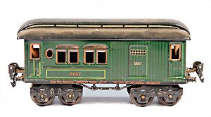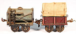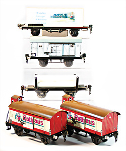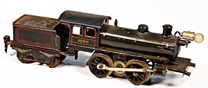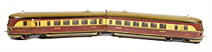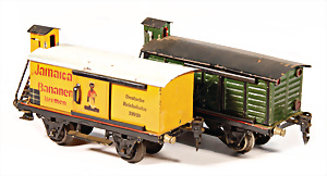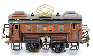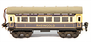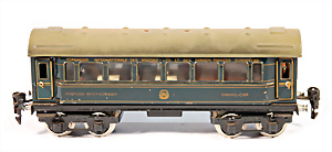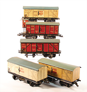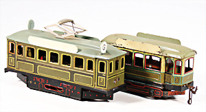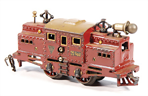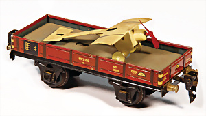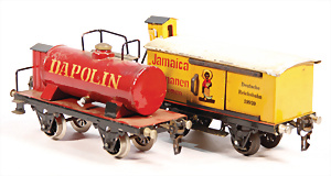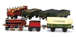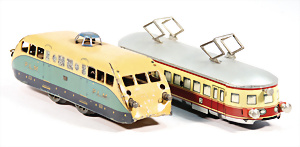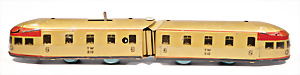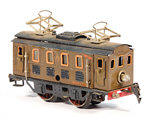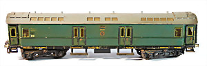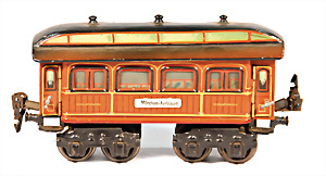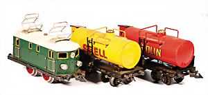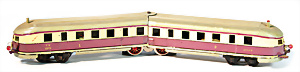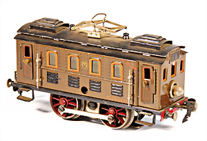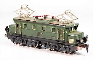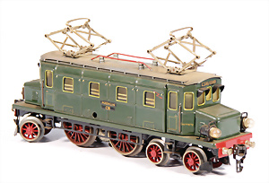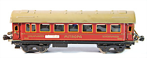 Spur 0, R12950N, Schlepptender-Lok, B, rot / schwarz mit gelben Zierlinien, Dach wohl farbl. überarbeitet, dazu 1721, Personenwagen, 2. Klasse, rot, 1721, Personenwagen, 2. Klasse, grün, leicht bespielt guter Zust., 1 Gepäckwagen, 1722, Lackfehler am Dach