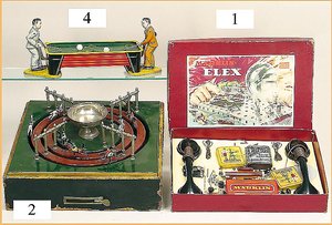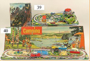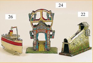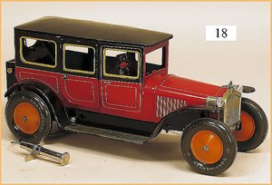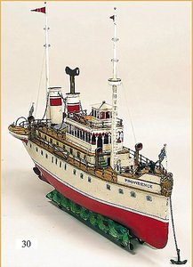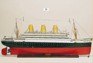 Märklin Ozeandampfer, ca. 1919, 98 cm, 3 Schornsteine, Uhrwerkantrieb, äußerst selten mit Orig.-Uhrwerk, sonst nur, in dieser Ausführung, als Schiff für Reisebüros, Uhrwerk intakt, 2 Schrauben, ein paar ausgebesserte Stellen, gut sichtbar, teilw. etwas Lackablösung, jedoch insges. für 1 Schiff dieser Zeit schöner Orig.-Zust.