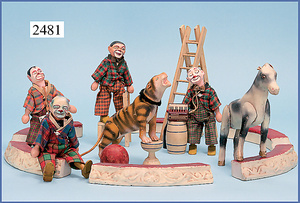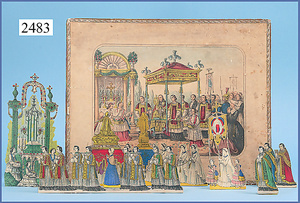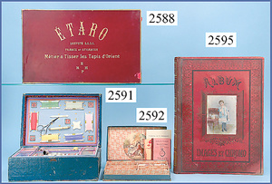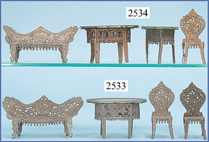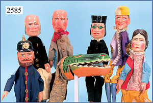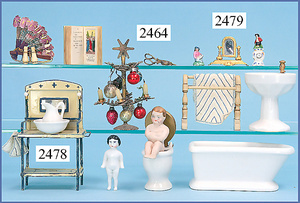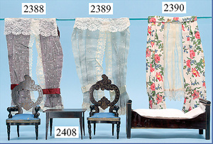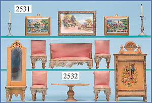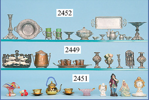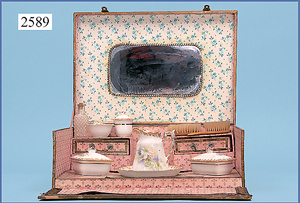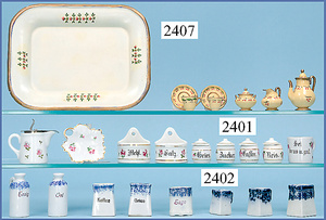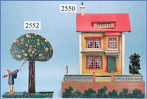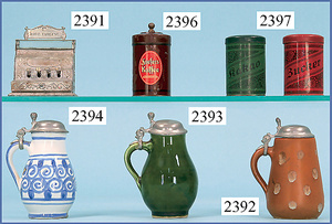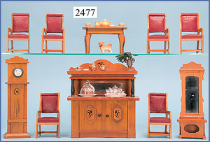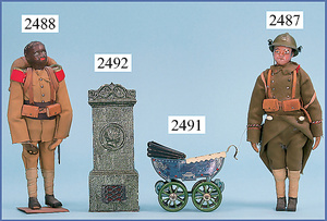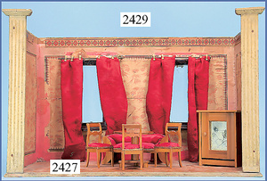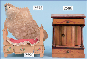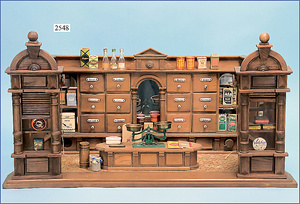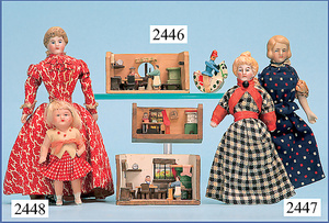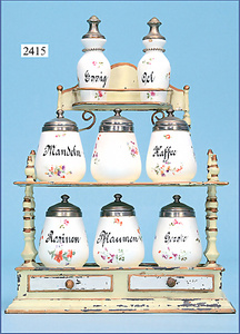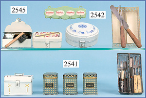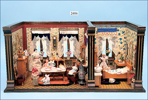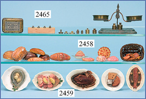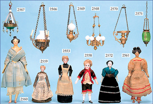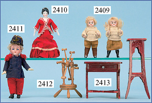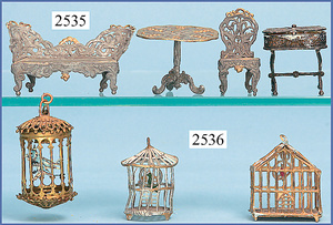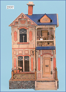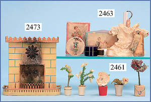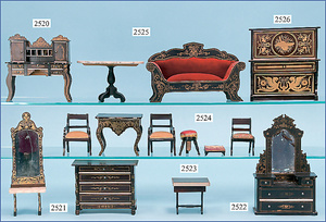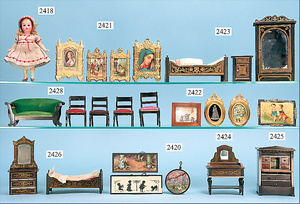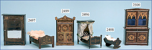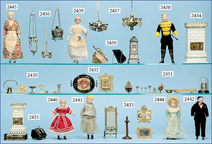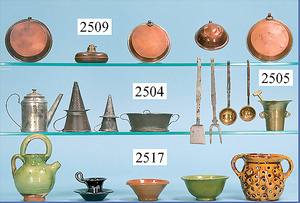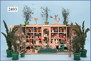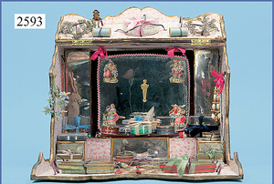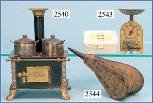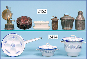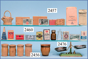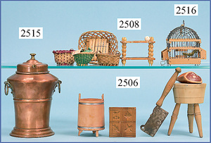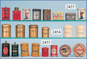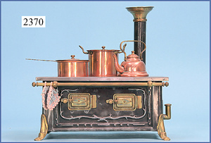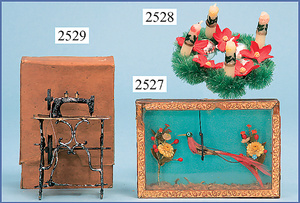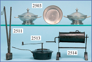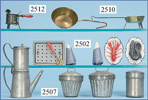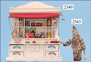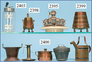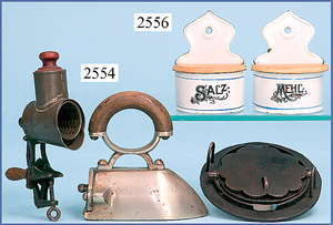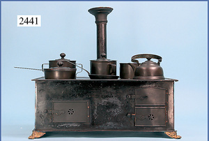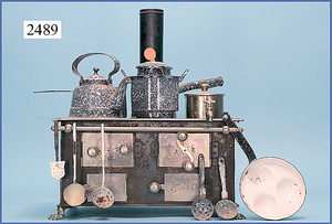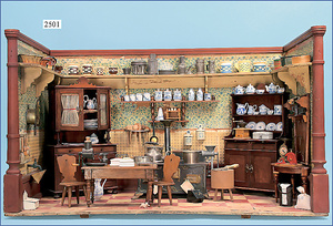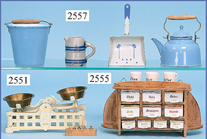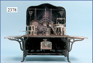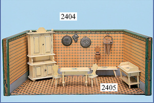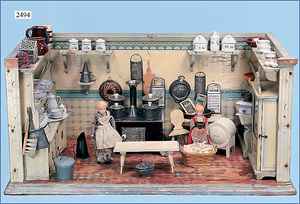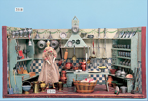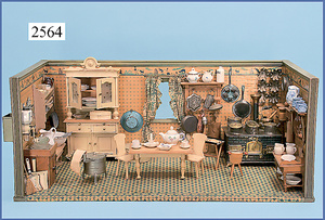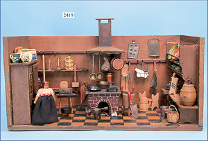 Rauchfangküche, 62 cm breit, 30 cm hoch, 31 cm tief, fest eingebaute Regale, Waschtisch, Brotschrank, Rauchfang, Feuerstelle ergänzt, Brett über dem Regal fehlt, Orig.-Bemalung, Wand u. Boden Orig.-Außenbemalung, Bierlack, reichhaltig bestückt, Zuckerbrecher, Essensträger ohne Porzellanteile, Holz-, Keramikteile, Weißblech, Kupfer, schöne Gr.