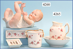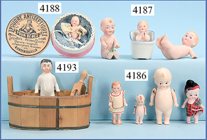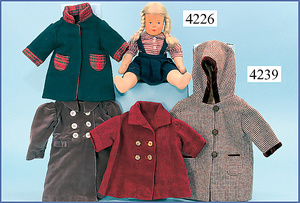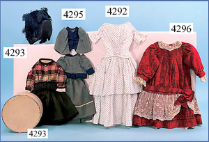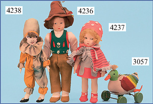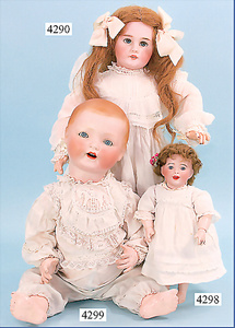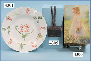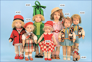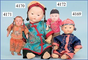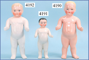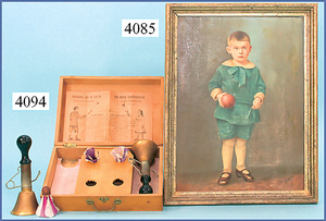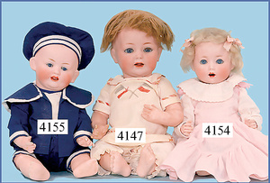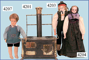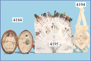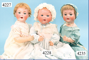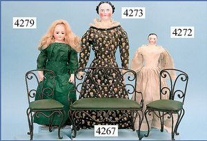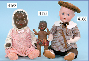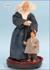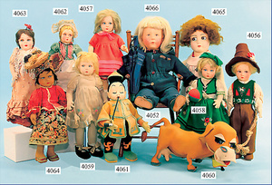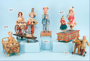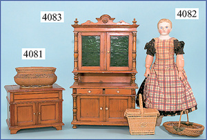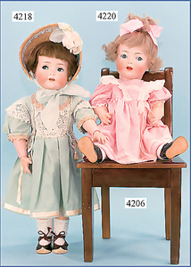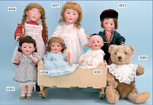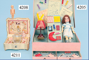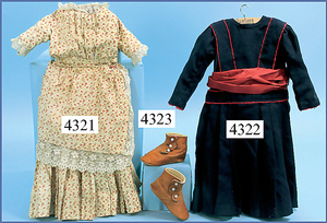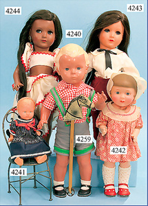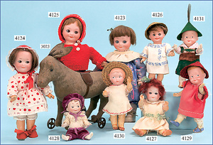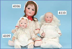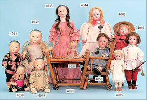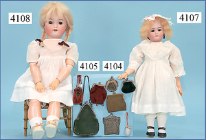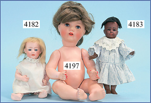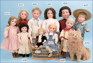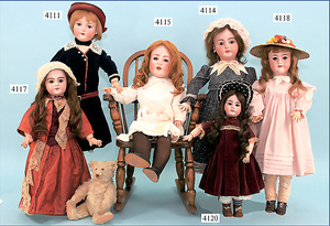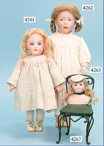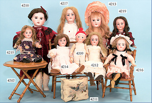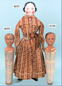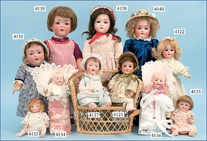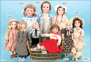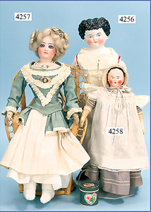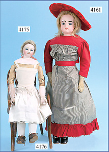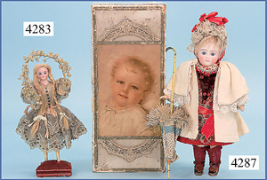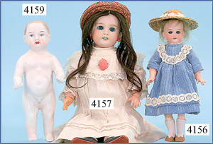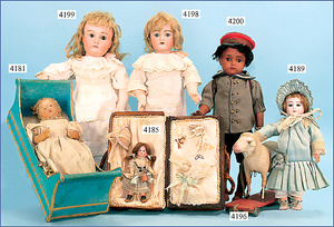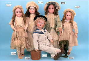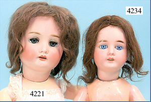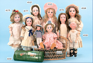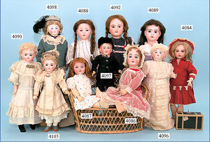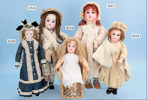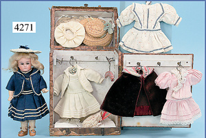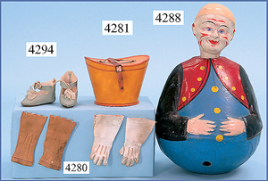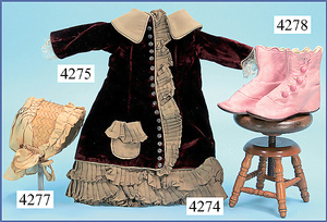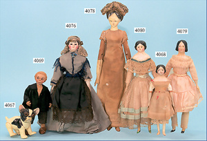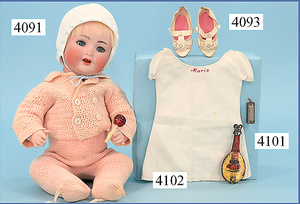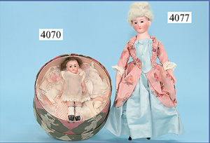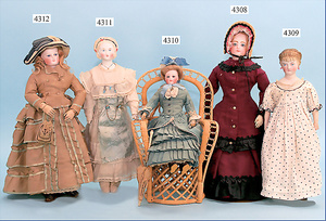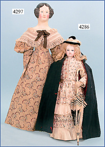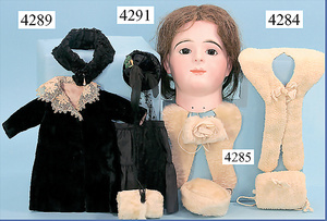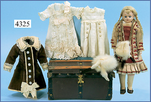 Modepuppe, Frankreich, gemarkt E, wohl BRU, Kurbelkopf, blaue fest eingesetzte Paperweightaugen, geschl. Mund, 2-farbig bemalt, ca. 1mm Porzellanabplatzer an 1 Wange, durchst. Ohren, auf Biskuitbrustblatt, Lederkörper mit eingeknickten Beinen, gegliederte Holzarme, 1 Daumen fehlt, Orig.-Mohairperücke mit Korkdeckel, Orig.-Kleidung u. Unterkleidung, Kleidung teilw. mit Mottenschäden, alte Schuhe, 42 cm, sehr schöner Ausdruck, Puppe wurde abgebildet im Buch Puppenraritäten