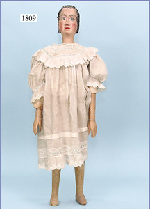 Puppenstuben-Puppe, früh, Wachs, Brustblatt-Kopf, fest eingesetzte blaue Augen, Kopf leicht seitl. geneigt, herunterfallendes lockiges Mohair, seitl. Wachsarme u. -beine, Stoffkörper, alte Kleidung u. Unterkleidung, für frühes museales Puppenhaus, 12,5 cm