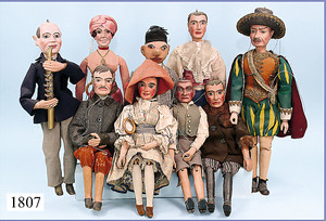 Konv. Kasperlepuppen, ca. 1910, 16 Teile Holz geschnitzt, handlackiert, meist guter Zust., teilw. sehr ausdrucksstark, Orig.-Kleidung, Orig.-Holzfüße, einige Füße beschädigt, 1 Buch Kasperle im Kasperland, lustige Geschichte von Josefi Liebe