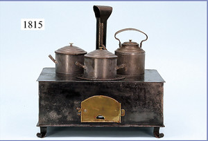 früher musealer Puppenküchenherd, ca. 1870, 35 cm, breit, 2 Töpfe, Wasserkessel, Schornstein, Tür vorne Messing (ergänzt)
