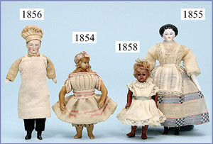 hochwertige Biedermeier-Puppenstuben-Puppe, 10,5 cm, glasierter Brustblattkopf, Chinahead, mit fein ausmodellierter Frisur, frei liegende Ohren, glasierte Porzellanarme u. -beine, Sitzkörper, außergew. Ausdruck für diese Gr., Orig.-Seidenkleid, Orig.-Unterkleid, Seide teilw. etwas verschlissen