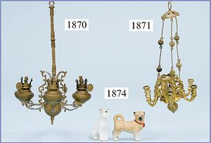 herrschaftl. Puppenstuben-Deckenlampe, Messingblech vergoldet, Glasperlen montiert, 8 cm hoch, mit Orig.-Wandhalter, 1 2 Entfernungen zur Wand einhängbar, selten (n. a. T. f. )