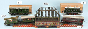 BING Spur 1, Zug, Schlepptenderlok B, elektr. Ausführung, elektr. beleuchteter Frontscheinwerfer, Zugsteuerungsschalter entfernt, Zweipersonenwagen, Gepäckwagen, schöner Orig.-Zust., 1 Türgriff am Gepäckwagen fehlt