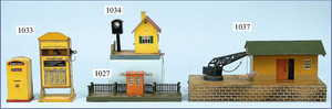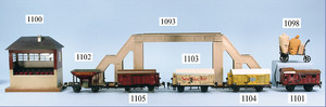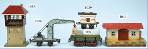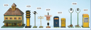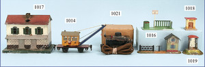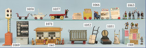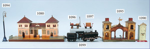 Bahnhof, Spur 0, Vorkrieg, Blech lithogr., vorne 2 Türen, Überdachung, lithogr. Durchgangsbereich, mit Fahrzeug u. Passanten, hinten Zugmotiv, sowie 2 Türen, bespielt, guter Zust.