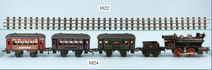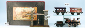 MÄRKLIN Uralt, Bodenläufer, mit Uhrwerkantrieb, Schlepptenderlok B, Blech, handlackiert, durchbrochene Gussräder, mit Kurveneinstellungen, durch Hebel im Heizraum, 1 Puffer, sowie Schornstein fehlen, bespielt, Orig.- Tender, Haken zwischen Lok und Tender fehlt, unberührter Dachbodenfund, dazu 1 Personenwagen, 1 Achse vorhanden, Dach fehlt, Lackierung in gutem Zustand