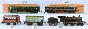 MÄRKLIN Spur 1, Schlepptenderlok B, teilw. farblich etwas ausgebessert, nur unter UV-Licht sichtbar, Stift am Aufziehmechanismus sitzt nicht richtig im dafür vorgesehenem Loch, handlackiert, grün/schwarz mit goldenen u. roten Zierlinien, Uhrwerk intakt, Vorwärts, Rückwärts, mit Bremse, Tender lithogr., wohl etwas jünger, jedoch altes MÄRKLIN-Zeichen, optisch in sehr schönem Zust.