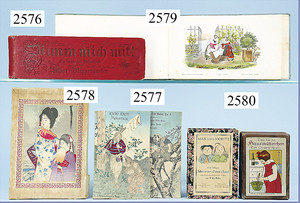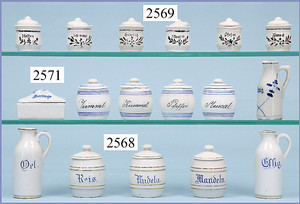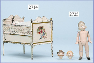 Rauchfangküche, 81 cm breit, 40,5 cm hoch, 46 cm tief, fest eingebautes Regal, Eckschrank, Bank, Tisch u. Stühle, 1 Küchenschrank, Rauchfang, früher Herd, Schornstein ergänzt, Backstein-Muster, Messing-Türen, Porzellan-Griffe, reichhaltiges bestückt, mit teilw. hochwertigen Zubehör-Teilen, blau/weiß emailliert, Porzellan-, Holz- u. Blech-Teile, Orig.-Bemalung, Bierlack außen, schöne Orig.-Bodenbemalung, alte Wandbemalung, Küche ca. 1880, Zubehör bis 1910, dazu 1 GROEDNER TAL Holz-Puppe, mit angeschnitzter Nase, 24 cm