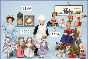 Puppenstube, um 1900, Länge 66 cm, Höhe 33 cm, Tiefe 32 cm, hinten Fenster, alte Tapete, möbliert, mit reichhaltigem Zubehör, u. a. Zinn, Porzellan, Glas u. Messing, 3 Puppenstuben-Puppen, 1x SIMON & HALBIG, 1 Mann mit Schnurrbart, 1 Kind, Frontsäulen farblich überarbeitet, Bodentapete teilw. verschlissen, ein wenig ausgebessert