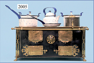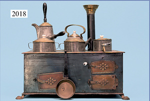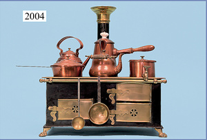 aufwendig gearbeiteter Puppenstuben-Ofen, vor 1900, Messinglöwentatzenfüße, Griffstange aufwendig gestaltete Türen, Messingverzierungen an den Ecken, Deckplatte mit Messingumrandung, 1 Seite fehlt, Wasserschiff, Weißblech mit Messingdeckeln, dazu Topfsatz, weiß/blau marmoriert emailliert, Wasserkessel, 2 Töpfe, Topfpfanne, 1 Pfanne, Topfsatz paßt im Größenverhältnis sowie weitgehend seitlich, 37 cm