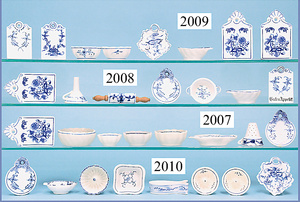 Konv. Puppenküchenteile, Porzellan, weiß, blaues Dekor, 4 Schüsseln, 5 Backformen, für Puppenküche mittl. Gr., guter Zust.