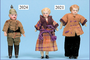 2 Puppenstuben-Puppen, Biedermeier, 19 cm, Biskuitkopf, -arme u. -beine, Stoffkörper, aufwendige Kleidung, alt o. aus alten Stoffen genäht