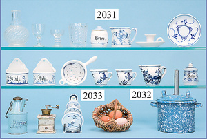 Konv. Puppenstuben-Porzellan, weiß, blaues Dekor, 3 Brettchen, 5 - 6,5 cm, Teigrolle, Trichter, Backform, Sieb, guter Zust., für mittelgr. Küche