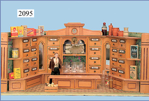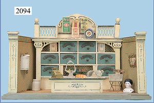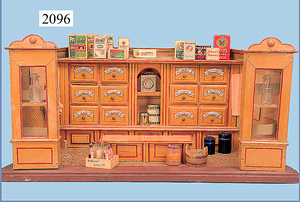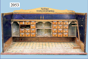 GOTTSCHALK, kl. Kaufladen, 50 cm breit, 32 cm hoch, Jugendstil, Schubladen mit geschwungenen Blechschildern, Orig.-Theke, Orig.-Bemalung, alte Tapete an den Wänden, eingerichtet als Kolonialwarenladen, schöne Gr.