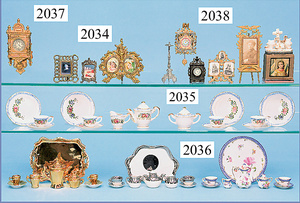 2 Puppenstuben-Uhren, Zinn, 7 u. 4,5 cm, 2 Tischbilder, kl. Staffelei, Messingblech vergoldet, Kerzenständer, 1 Würfel mit sakralem Aufbau