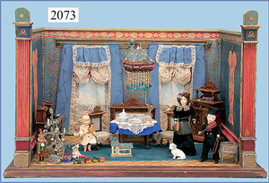 1-teilige Puppenstube, 67 cm breit, 43 cm hoch, 41 cm tief, Tapeten teilw. ergänzt, einige Leisten u. Verzierungen später, alte Vorhänge, möbliert, Tisch, Sofa, 2 Stühle, Schrank, Schreibtisch mit Ausschmückungsteilen, weihnachtliche Bescherungsszene, Puppenstuben-Mutter, 17 cm, Biskuitkopf, -arme u. -beine, Stoffkörper, Kleidung aus alten Stoffen genäht, Perücke neuer, Junge mit Zylinder, Stoffrumpf, Biskuitarme u. -beine, fest aufgenähte Kleidung, Zust. des Körpers kann nicht kontrolliert werden, kl. Ganzbiskuitmädchen, 11,5 cm, einige Geschenkausschmückungsteile, teils älter, teil neuer, dekor.