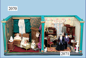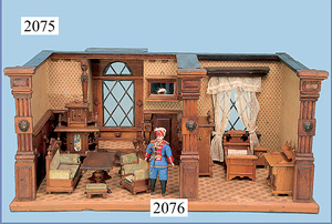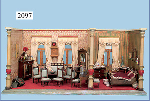 2-teilige Puppenstube, 2 Zimmer im altdeutschen Stil, 76 cm breit, 35 cm hoch, 34 cm tief, ca. 1880, 3 in Formenvielfalt aufwendig gestaltete Frontleisten, mit aufgesetzten Löwenköpfen, Salon u. Schlafzimmer rundum laufendes, schweres Eichengesims u. 1 aufwendig verzierte Vertäfelung im Salon, mit Sockel u. Profilleisten, Säulen, Kassetten u. Schnitzereien, ein paar Treppen mit reich ornamentiertem Geländer, gehören zu den eingetäfelten bleiverglasten Fenstern, vertäfelte Durchgangstür, mit Rahmen, Sitzgruppe, Samt bezogen, Höhe Rückenlehne ,mit geschnitztem Aufsatz u. Türmchen, aufwendig gearbeiteter Schrank, mit Galerien, Konsolen, Balustraden u. Drechseleien, Schlafzimmer, Bett, Spiegelschrank, Kommode mit Zinnbeschlägen, schöne Ausstrahlung, aus Museumsauflösung