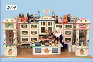 Kaufladen, ca. 1910, eingerichtet als Puppenstuben-Apotheke, Schubladen mit Messing-Griffen, seitl. Schaufenster mit Säulen gefasst, Orig.-Theke, vordere Verzierungen ergänzt, alte Bemalung, mit reichh. Zubehör, Giftschrank mit davor baumelndem Totenkopf u. naturgetreuem Gebiss mit Zahnpastatube, Glasflaschen, kl. Kasse, Blech lithogr., schöne Ganzbiskuit-Puppenstubenpuppe, Frankreich, 21 cm, Biskuit-Kurbelkopf, blaue fest eingesetzte Glasaugen, geschl. Mund, Biskuitarme u. -beine, bewegl. mit aufgemalten Schuhen, dazu außergew. Dekoration, Skelett, Holz-Masse, 23 cm, mit Giftschrank, davor baumelnder Totenkopf