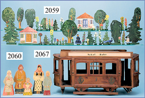 Schulbahn, Holz, Straßenbahn, 63 cm lang, ca. 1910, mit Inneneinrichtung, Bänke, Fenster mit Glasscheiben, Türen z. Ö., schöne Puppendeko., Orig.-Zust.