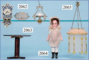 Konv. 3 Teile, 1 Puppenstubenleuchter, Zinn, Glas montiert, 8 cm, 1 Uhr, Blech lithogr., 10 cm, kl. Korb, Zinn
