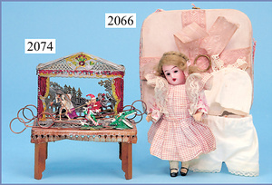 kl. franz. Reisepuppenstube, aufklappbar, ca. 1910, wohl GOTTSCHALK für den franz. Markt, 31 cm breit, 30 cm tief, 13 cm hoch, Orig.-Tapete, innen Ranken-, außen Reptilmuster, an den Wänden Oblatenschmuck, 5 kl. Frauenportraits, dazu 6-teiliges Schlafzimmer-Mobiliar, mit Goldspitzen verkleidete Kanten, Baldachin über dem Bett u. einem abgeschrägten Eckfenster, kl. außergew. Modepuppe, Biskuitbrustblattkopf, -arme u. -beine, Stoffkörper, Orig.-Kleidung, für die Zeit typisch angewinkelte Arme, schöne Gr., schöner Orig.-Zust.
