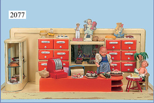 kl. Puppenstuben-Kaufladen, um 1900, 64 cm breit, 31,5 cm, rückwandig Schubladen mit geschwungenen Blechschildern, seitlich Schaufenster, Orig.-Bemalung, Orig.-Tapete an Wand u. Boden, Orig.-Theke, reichhaltigst Zubehör, Pappschachteln, Glasteile, Blechdosen