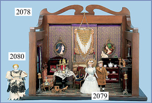 kl. dekor. 2-teilige Puppenstube, Biedermeier, 59 cm breit, 29 cm hoch, gedrehte Frontleisten, Durchgangstür, 3 Fenster, Tapeten u. Farben neuer, möbliert mit schönem Birnbaum- Möbelprogrammteile, Porzellan- u. Zinnteile, Deckenleuchter, Zinn-Puppenwagen, 2 Puppenstuben-Puppen