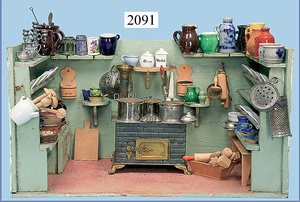 kl. Puppenküche vor 1900, 49 cm breit, 26 cm hoch, fest eingebaute Regale, Bemalung alt, jedoch nicht mehr die erste, Herd mit Löwentatzenfüßen, reichhaltigst Zubehör, Weißblech, Keramikteile, Holzteile, schöne Gr.