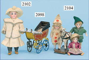 Mignonnette, 14 cm, fester Biskuitkopf, blaue fest eingesetzte Glasaugen, geschl. Mund, Mohairperücke, bewegl. Arme u. Beine, aufgemalte Schuhe u. Strümpfe, schöne Orig.-Kleidung