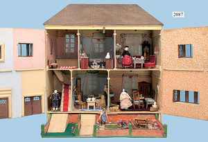 holländisches Puppenhaus, mit ausziehbaren Vorgarten, um 1900, 65 cm breit, 70 cm hoch, 35 cm tief, Walmdach mit aufgemalter Schiefertapete, 4 Zimmer, mit Treppenaufgang, in Blech gearbeitet, eingebaute Kamine, Fassade vorne zum Öffnen, mit heraustretenden Giebelfenstern, in Blech gearbeitet, ein paar Fensterläden fehlen, alle Zimmer haben rückwärtige Fenster, alte Tapete innen u. außen, im altersbedingten Zust., Mobiliar teilw. im Biedermeierstil, mit hochwertigem Zubehör, Zinnteile, einige Teile Messingblech vergoldet, kl. Miniaturskulpturen, Biedermeier-Puppenstuben-Puppen, Biskuit u. glasiert, teilw. ausgef. Frisuren, dekor. Form, schöne Gr., mit reichhaltigem, teils hochwertigem Zubehör