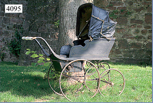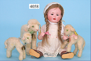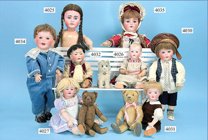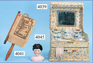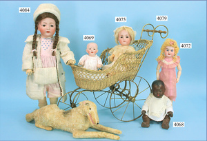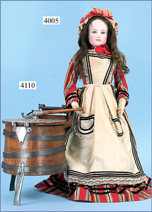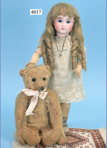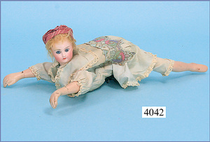 Modepuppe, JUMEAU Typ, Frankreich, Paris, Biskuitporzellankurbelkopf, auf Biskuitbrustblatt, grau/blaue fest eingesetzte Glasaugen, durchst. Ohren, Korkdeckel, Mohairperücke, mit Haarnetz, durchst. Ohren, geschl. Mund, 2-farbig bemalt, Jumeau-Lederkörper, mit abgenähten Fingern, Orig.-Kleidung, mit passender Umhangtasche, Ansteckuhr, Unterwäsche u. Schuhe teilw. etwas verschlissen, 43 cm, ca. 1875, sehr schöner Ausdruck