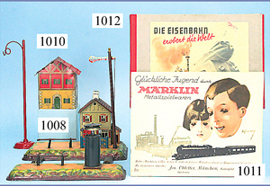 MÄRKLIN Uralt, Bahnwärterhaus, mit Brunnen, Bank und Signal, auf kl. halbrundem Sockel, Haus mit kompl. Orig.-Verglasung, guter Zust., mit nur kl. altersbedingten Lackfehlern, sowie Ringen u. Farbausbesserungen an der Bodenplatte, 15 cm x 14 cm