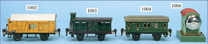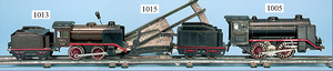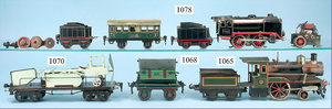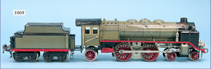 Spur 0, wohl Carette-Storchbein, Spirituslok, 29 cm, Dampfausstoss durch den Kamin, Pfeife u Sicherheitsventil, 1 Seite Fahrerhaus ausgebessert, sonst nur geringe Spielspuren, guter Zust., Tender sehr guter Zust.