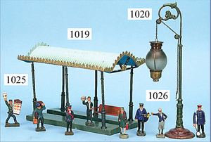 MÄRKLIN Landbahnhof, passend 0+I, Grundplatte 47 cm x 28 cm, Höhe 26 cm, mit Sitzgruppe und 3 Orig.-Figuren, Kartenhäuschen mit Zaun, 1 Fensterkreuz ergänzt, 1 Vordach neu befestigt, farbl. etwas ausgebessert, sonst guter Zust., mit Spielspuren